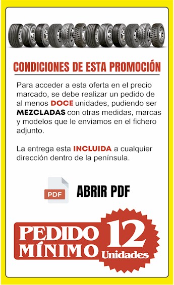 Portes pagados para pedidos de 2 o más neumáticos para cualquier punto de la Península; para compras de 1 neumático el porte sería 8 € más iva. Para otros tipo de envíos, o para las Islas Baleares consulten portes a su agente comercial o llamando al 673 188 652.